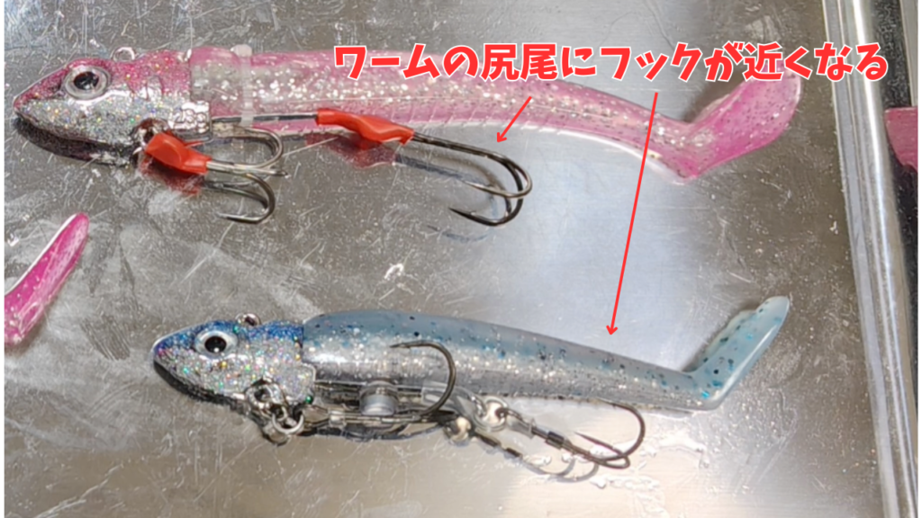 また、針の先端をワームに近づけているのも効果があると思っていて、これは海の中で見てみないと分からないところではあるんですけど、テールだけ当たるようなことが減っていると思います。