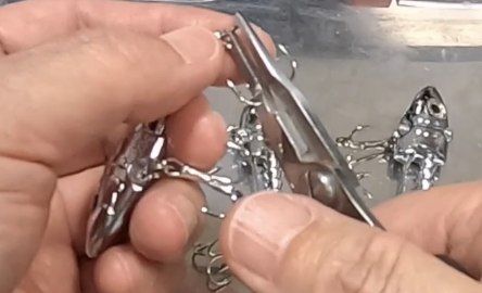 画像の下のルアー(青い方)は、ダブルフックを使っていますが、前方のフックには磁石をワームのボディに埋め込み、フックを接着させて固定しています。