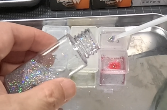 ダイソーなどで購入できる、クラフト用のグリッターや、蓄光パウダー、シルバーパウダーなど好みの量で混ぜていきます。