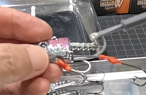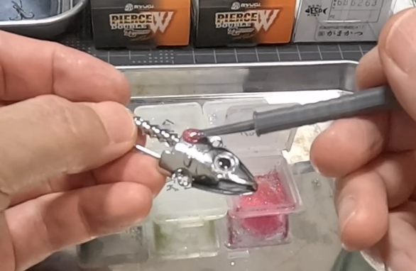 ジグヘッドの部分のカラーリングと、フックの根本の部分などにカラーリングしていきます。