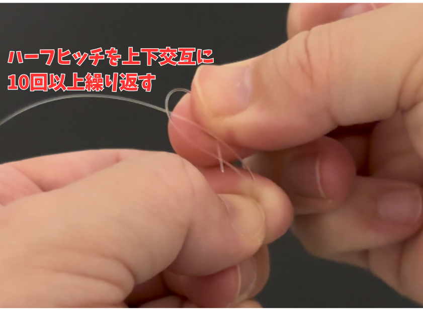 - ハーフヒッチを上下交互に10回以上繰り返す(最初の方の締め込みがかなり重要)