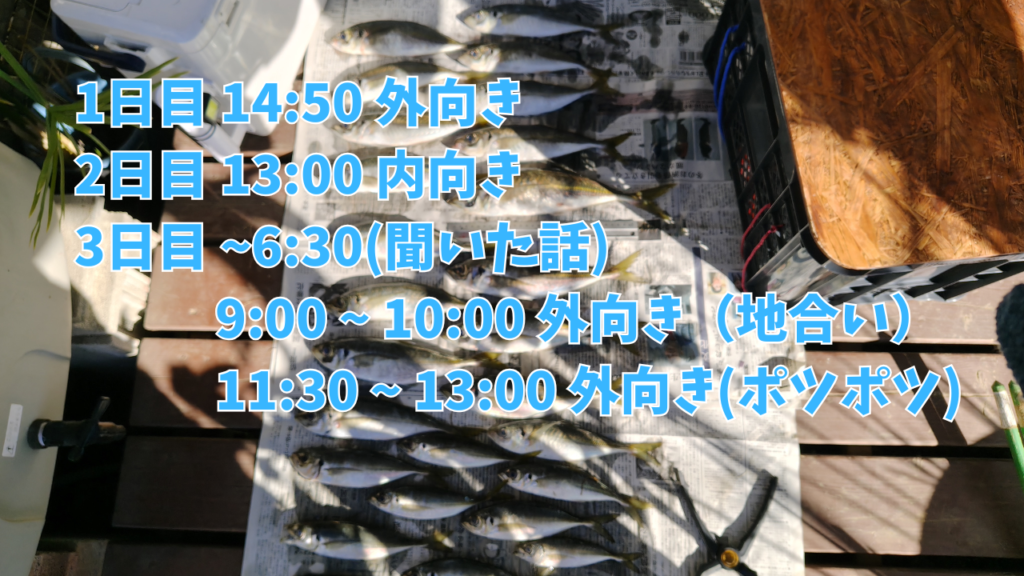 今回の釣行3日間で尺アジが釣れた時間帯を表にまとめてみました。
